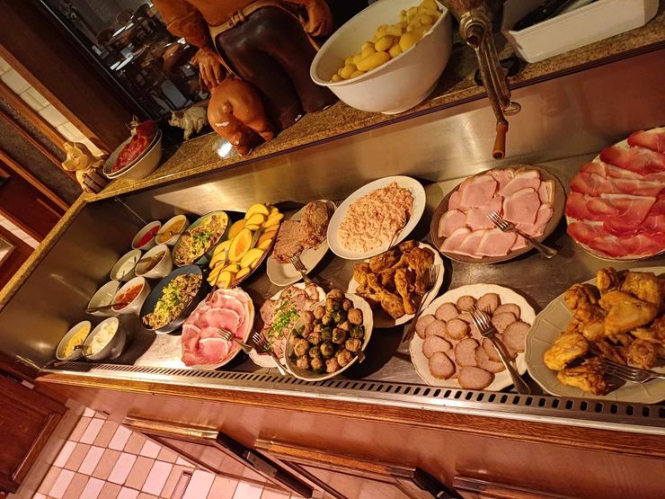 Gasten genieten van een veelzijdig buffet met zowel warme als koude bereidingen, waarbij streekproducten en huisgemaakte recepten de hoofdrol spelen. Daarnaast biedt de “Oklahoma BBQ” een selectie gegrilde specialiteiten, met onder meer een sappige Côte à l’os voor de liefhebber. Voor jonge gasten is er een kindvriendelijke kaart en een ruime speelweide. De drankenkaart omvat onder andere regionale bieren, zorgvuldig gekozen wijnen en diverse andere verfrissingen die perfect aansluiten bij het buffetconcept.