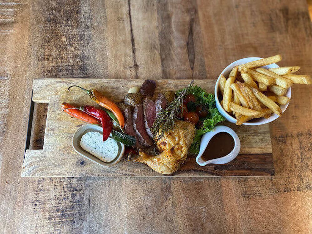 Bij Bisou wordt gewerkt met seizoensgebonden producten van lokale herkomst. Overdag staan er huisgemaakte soepen, salades en rijk belegde broodjes op de kaart. ’s Avonds kan je kiezen voor klassiekers zoals steak met frieten, aangevuld met visgerechten, vegetarische opties en wisselende suggesties van de chef.